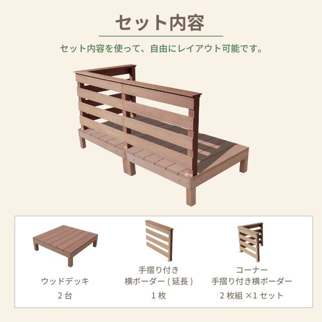 ◆組み立てに必要なビス・ボルト類は同梱しております。 ◆モニターの発色具合によって実際の商品と色味が異なる場合がございます。 ◆素材の性質上、開封直後は商品画像より白っぽく見えることがあります。 ◆商品寸法・重量は多少の誤差が発生いたしますが、安全・品質に問題がない限り、仕様とさせていただきます。 ◆当店の商品はすべて、店頭と同時販売を行っております。 迅速に在庫確認はしておりますが、タイムラグで売り切れとなり、お届けにお時間をいただく場合がございます。 ◆注意事項: アイウッド人工木商品は、弊社が独自に開発したオリジナル素材およびオリジナルカラーを使用しております。材質から色まで他社商品との互換性はありませんので、従って他社商品と一緒に使用する場合や商品画像の色と実際の商品色に違いがある場合、それを理由とした返品はお受けできません。材質と色についてご心配の方は、事前に弊社のアイウッド人工木カラーサンプルをご購入いただき、商品色をご確認の上でご購入ください。 日照の強い場所で使う場合は、気温により多少の伸縮や反りが発生する場合があります。ご理解のほど宜しく御願い致します。 |