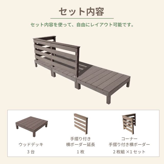 ◆組み立てに必要なビス・ボルト類は同梱しております。 ◆モニターの発色具合によって実際の商品と色味が異なる場合がございます。 ◆素材の性質上、開封直後は商品画像より白っぽく見えることがあります。 ◆商品寸法・重量は多少の誤差が発生いたしますが、安全・品質に問題がない限り、仕様とさせていただきます。 ◆当店の商品はすべて、店頭と同時販売を行っております。 迅速に在庫確認はしておりますが、タイムラグで売り切れとなり、お届けにお時間をいただく場合がございます。 ◆注意事項: アイウッド人工木商品は、弊社が独自に開発したオリジナル素材およびオリジナルカラーを使用しております。材質から色まで他社商品との互換性はありませんので、従って他社商品と一緒に使用する場合や商品画像の色と実際の商品色に違いがある場合、それを理由とした返品はお受けできません。材質と色についてご心配の方は、事前に弊社のアイウッド人工木カラーサンプルをご購入いただき、商品色をご確認の上でご購入ください。 日照の強い場所で使う場合は、気温により多少の伸縮や反りが発生する場合があります。ご理解のほど宜しく御願い致します。 |