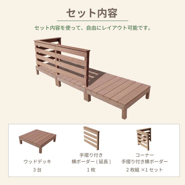 ◆組み立てに必要なビス・ボルト類は同梱しております。 ◆モニターの発色具合によって実際の商品と色味が異なる場合がございます。 ◆素材の性質上、開封直後は商品画像より白っぽく見えることがあります。 ◆商品寸法・重量は多少の誤差が発生いたしますが、安全・品質に問題がない限り、仕様とさせていただきます。 ◆当店の商品はすべて、店頭と同時販売を行っております。 迅速に在庫確認はしておりますが、タイムラグで売り切れとなり、お届けにお時間をいただく場合がございます。 ◆注意事項: アイウッド人工木商品は、弊社が独自に開発したオリジナル素材およびオリジナルカラーを使用しております。材質から色まで他社商品との互換性はありませんので、従って他社商品と一緒に使用する場合や商品画像の色と実際の商品色に違いがある場合、それを理由とした返品はお受けできません。材質と色についてご心配の方は、事前に弊社のアイウッド人工木カラーサンプルをご購入いただき、商品色をご確認の上でご購入ください。 日照の強い場所で使う場合は、気温により多少の伸縮や反りが発生する場合があります。ご理解のほど宜しく御願い致します。 |
