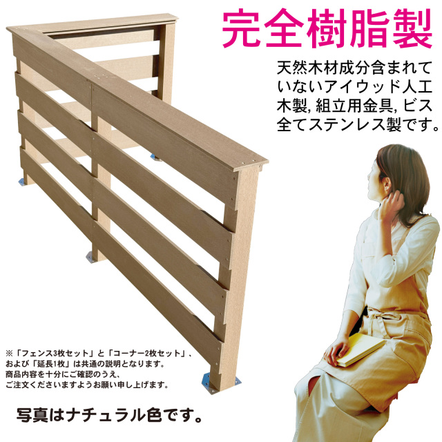 ◆組み立てに必要なビス・ボルト類は同梱しております。 ◆モニターの発色具合によって実際の商品と色味が異なる場合がございます。 ◆素材の性質上、開封直後は商品画像より白っぽく見えることがあります。 ◆商品寸法・重量は多少の誤差が発生いたしますが、安全・品質に問題がない限り、仕様とさせていただきます。 ◆当店の商品はすべて、店頭と同時販売を行っております。 迅速に在庫確認はしておりますが、タイムラグで売り切れとなり、お届けにお時間をいただく場合がございます。 ◆注意事項: アイウッド人工木商品は、弊社が独自に開発したオリジナル素材およびオリジナルカラーを使用しております。材質から色まで他社商品との互換性はありませんので、従って他社商品と一緒に使用する場合や商品画像の色と実際の商品色に違いがある場合、それを理由とした返品はお受けできません。材質と色についてご心配の方は、事前に弊社のアイウッド人工木カラーサンプルをご購入いただき、商品色をご確認の上でご購入ください。 日照の強い場所で使う場合は、気温により多少の伸縮や反りが発生する場合があります。ご理解のほど宜しく御願い致します。 |