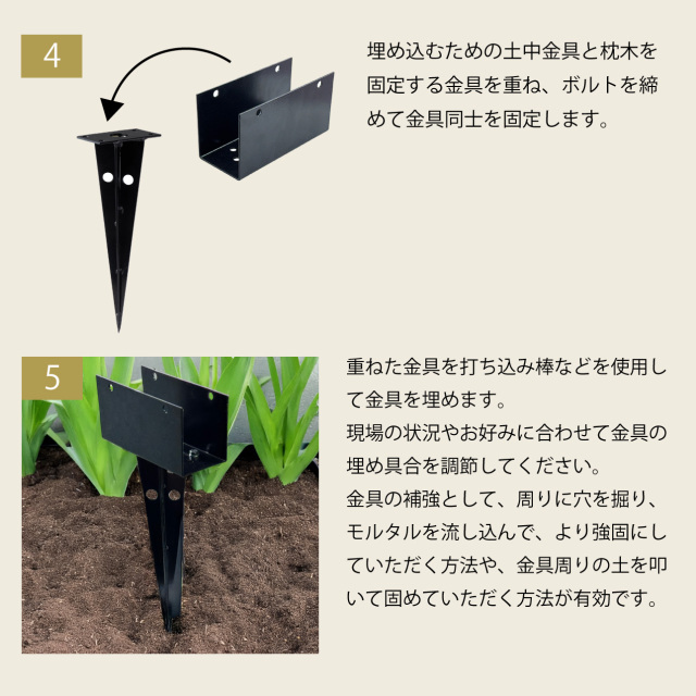 枕木や角柱を土中にしっかり固定するためのスチール製金具です。
