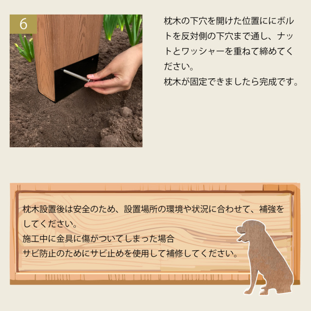 アイウッド枕木対応固定金具、土中に埋め込んで枕木を固定します。設置も簡単です。 ◆組み立てに必要なビス・ボルト類は全てステンレス製で同梱しております。 ◆ボルトを締めすぎると、金具が変形してしまう恐れがあります。ご注意ください。 ◆施工中に金具に傷がついてしまった場合、サビ防止のためにサビ止めを使用して補修してください。