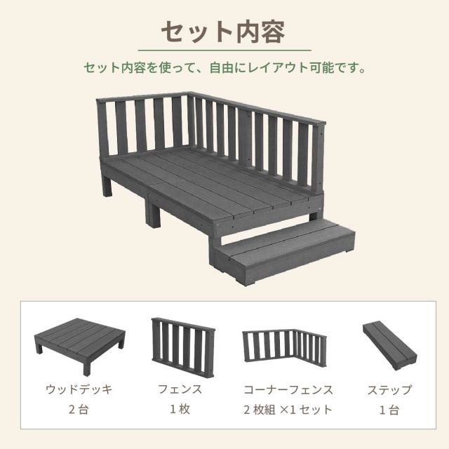 デッキ:幅1800×奥行900×高さ280 フェンス:幅900×奥行86×高さ450 ステップ:幅900×奥行265×高さ123 |