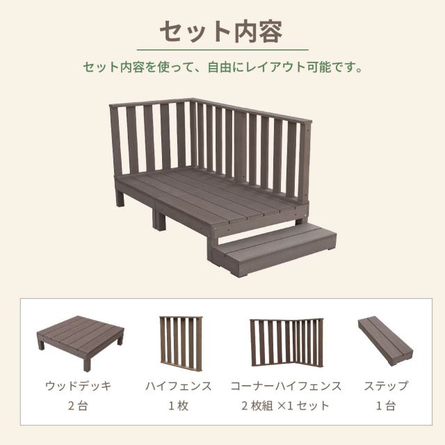 デッキ:幅1800×奥行900×高さ280 フェンス:幅900×奥行86×高さ800 ステップ:幅900×奥行265×高さ123 |
