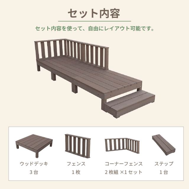 デッキ:幅2700×奥行900×高さ280 フェンス:幅900×奥行86×高さ450 ステップ:幅900×奥行265×高さ123 |