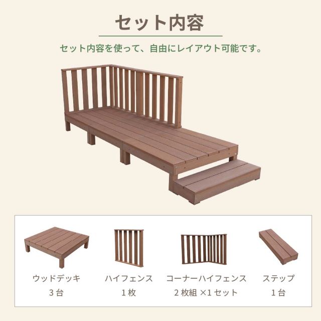 デッキ:幅2700×奥行900×高さ280 フェンス:幅900×奥行86×高さ800 ステップ:幅900×奥行265×高さ123 |
