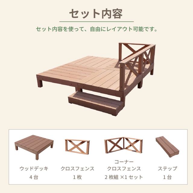 デッキ:幅1800×奥行1800×高さ280 フェンス:幅900×奥行86×高さ450 ステップ:幅900×奥行265×高さ123 |
