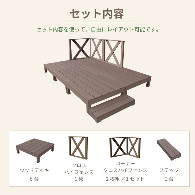 デッキ:幅2700×奥行1800×高さ280 フェンス:幅900×奥行86×高さ800 ステップ:幅900×奥行265×高さ123 |