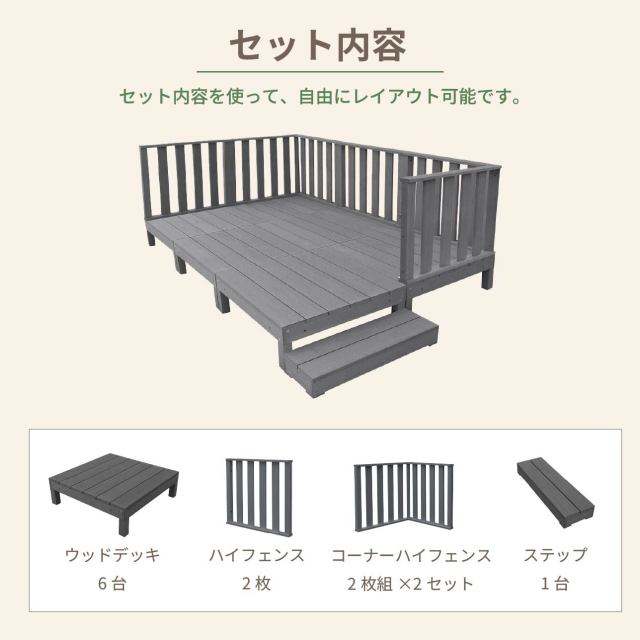 デッキ:幅2700×奥行1800×高さ280 フェンス:幅900×奥行86×高さ800 ステップ:幅900×奥行265×高さ123 |