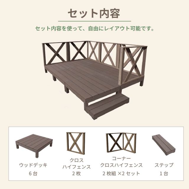 デッキ:幅2700×奥行1800×高さ280 フェンス:幅900×奥行86×高さ800 ステップ:幅900×奥行265×高さ123 |