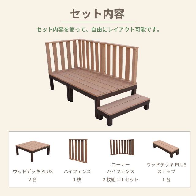 デッキ:幅1800×奥行900×高さ400〜440 フェンス:幅900×奥行86×高さ800 ステップ:幅900×奥行285×高さ200〜240 |