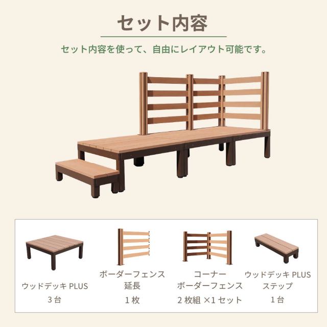 デッキ:幅2700×奥行900×高さ400〜440 フェンス:幅900×奥行86×高さ810 ステップ:幅900×奥行285×高さ200〜240 |