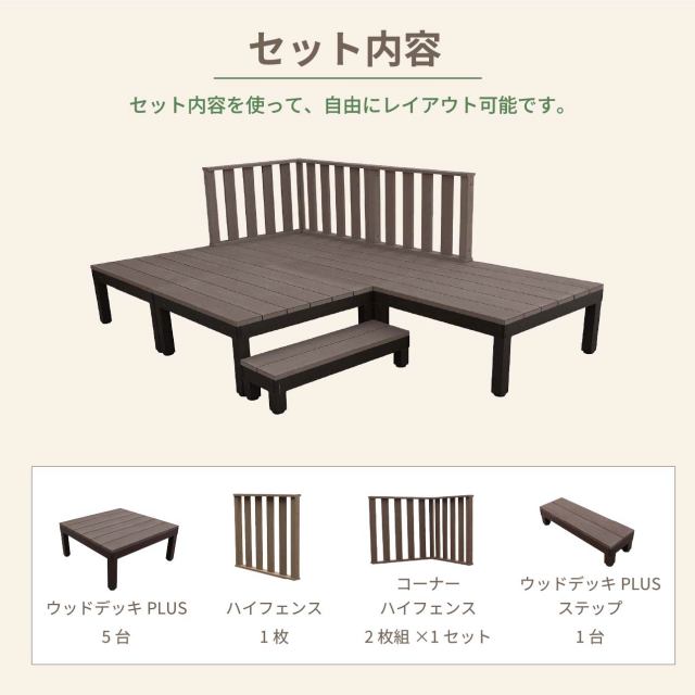 デッキ:幅2700×奥行1800×高さ400〜440 フェンス:幅900×奥行86×高さ800 ステップ:幅900×奥行285×高さ200〜240 |