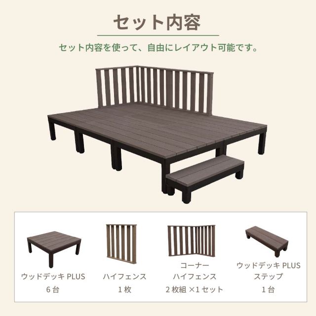 デッキ:幅2700×奥行1800×高さ400〜440 フェンス:幅900×奥行86×高さ800 ステップ:幅900×奥行285×高さ200〜240 |