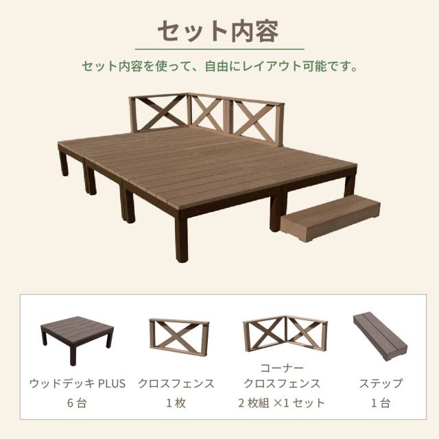 デッキ幅2700×奥行1800×高さ400~440 フェンス幅900×奥行86×高さ450 (1枚) ステップ幅900×奥行265×高さ123 |