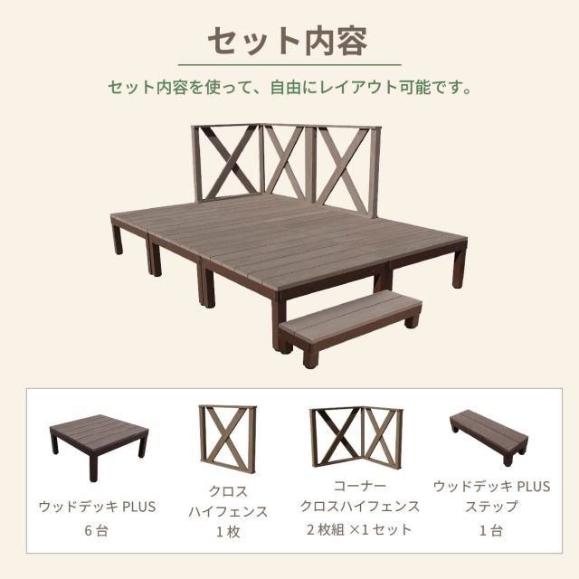 デッキ:幅2700×奥行1800×高さ400〜440 フェンス:幅900×奥行86×高さ800 ステップ:幅900×奥行285×高さ200〜240 |