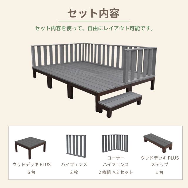 デッキ:幅2700×奥行1800×高さ400〜440 フェンス:幅900×奥行86×高さ800 ステップ:幅900×奥行285×高さ200〜240 |