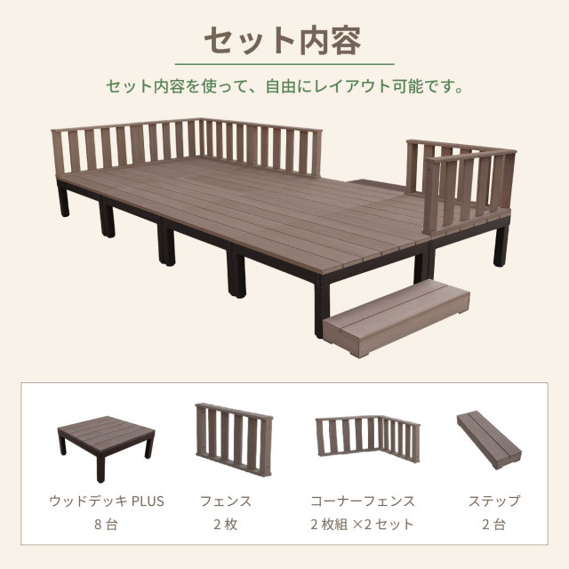 デッキ:幅1800×奥行900×高さ400~440 フェンス:幅900×奥行86×高さ450 ステップ:幅900×奥行265×高さ123 |