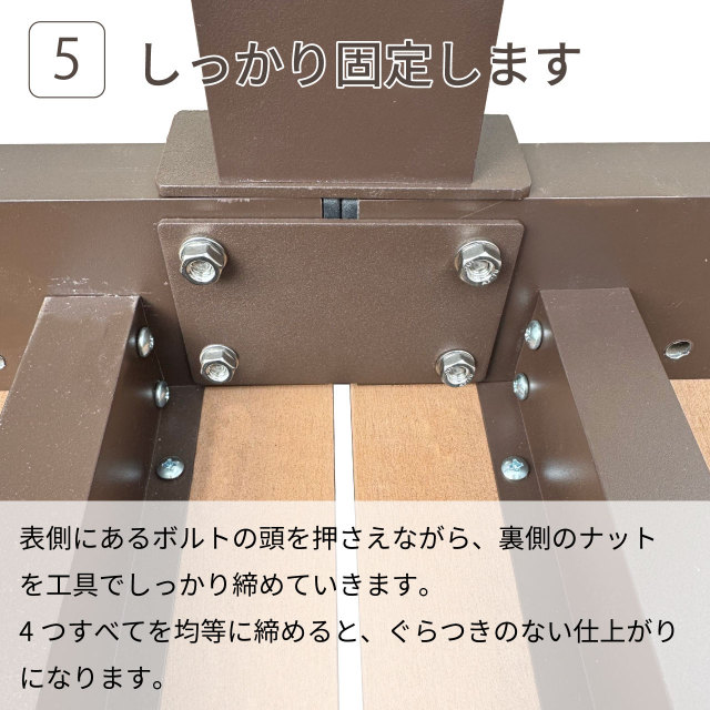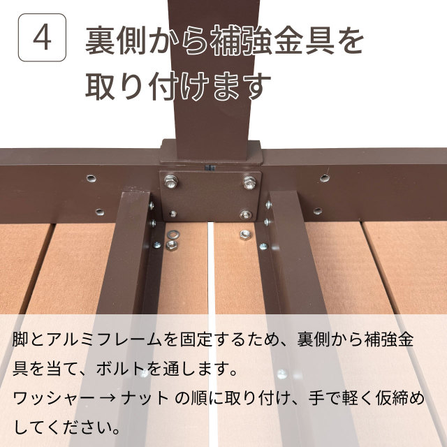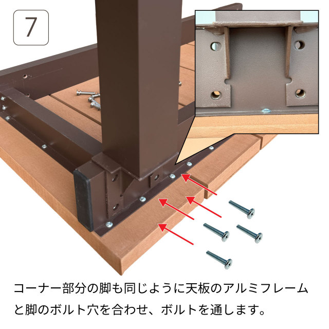 天板:アイウッド人工木 フレーム:アルミ ボルト・ナット:ステンレス アジャスタ:強化プラスチック |