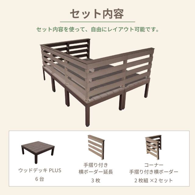 ◆組み立てに必要なビス・ボルト類は同梱しております。 ◆モニターの発色具合によって実際の商品と色味が異なる場合がございます。 ◆素材の性質上、開封直後は商品画像より白っぽく見えることがあります。 ◆商品寸法・重量は多少の誤差が発生いたしますが、安全・品質に問題がない限り、仕様とさせていただきます。 ◆当店の商品はすべて、店頭と同時販売を行っております。 迅速に在庫確認はしておりますが、タイムラグで売り切れとなり、お届けにお時間をいただく場合がございます。 ◆注意事項: アイウッド人工木商品は、弊社が独自に開発したオリジナル素材およびオリジナルカラーを使用しております。材質から色まで他社商品との互換性はありませんので、従って他社商品と一緒に使用する場合や商品画像の色と実際の商品色に違いがある場合、それを理由とした返品はお受けできません。材質と色についてご心配の方は、事前に弊社のアイウッド人工木カラーサンプルをご購入いただき、商品色をご確認の上でご購入ください。 日照の強い場所で使う場合は、気温により多少の伸縮や反りが発生する場合があります。ご理解のほど宜しく御願い致します。 |