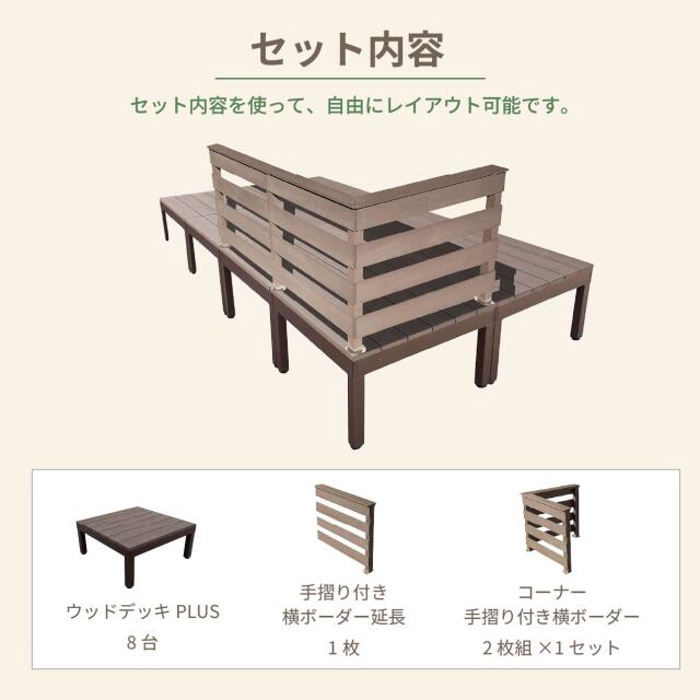 ◆組み立てに必要なビス・ボルト類は同梱しております。 ◆モニターの発色具合によって実際の商品と色味が異なる場合がございます。 ◆素材の性質上、開封直後は商品画像より白っぽく見えることがあります。 ◆商品寸法・重量は多少の誤差が発生いたしますが、安全・品質に問題がない限り、仕様とさせていただきます。 ◆当店の商品はすべて、店頭と同時販売を行っております。 迅速に在庫確認はしておりますが、タイムラグで売り切れとなり、お届けにお時間をいただく場合がございます。 ◆注意事項: アイウッド人工木商品は、弊社が独自に開発したオリジナル素材およびオリジナルカラーを使用しております。材質から色まで他社商品との互換性はありませんので、従って他社商品と一緒に使用する場合や商品画像の色と実際の商品色に違いがある場合、それを理由とした返品はお受けできません。材質と色についてご心配の方は、事前に弊社のアイウッド人工木カラーサンプルをご購入いただき、商品色をご確認の上でご購入ください。 日照の強い場所で使う場合は、気温により多少の伸縮や反りが発生する場合があります。ご理解のほど宜しく御願い致します。 |
