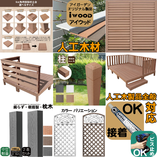 アイウッド人工木に適用している強力な溶剤性接着剤です。ウッドデッキの設置や、目隠しフェンスの設置、枕木、ポスト、人工木材、水栓柱などアイウッド商品全般的にサポートします。