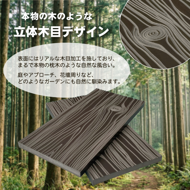 表面にはリアルな木目加工を施しており、まるで本物の枕木のような自然な風合い。